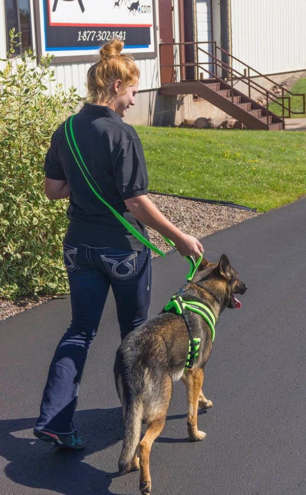 The purpose of the EEWALKER Hands Free Leash is to keep your dog in position while walking or working with you. The EEZWALKER leash is very functional and should be a tool for training every dog. With your dog by your side it learns to adapt to your body movements and your stride. It doesn’t have the option to run here or there. It learns to do what you want it to and can even anticipate what direction you are going to move and move with you.