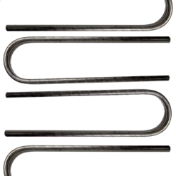These are no wimpy thin stakes. Made from thick ¼” cold rolled steel with a clear coating on them. They area a full U-loop style stake and measure 8” long. They will fit a pipe or bar up to 1.5” wide. The stake ends are mitered so they are easy to get started into the ground.