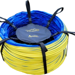 The Activedogs.com Agility Tunnel Tamer is just that. These large 4” pitch tunnels are heavy and unruly to put away and move around. The Activedogs.com 20’ tunnel weights over 60 pounds. The tunnel tamer is a life saver and is so easy to use. It is constructed of six heavy duty poly straps. Poly is a better material for outdoor use as it will not rot as fast as nylon. Because each strap has a looped handle two people can carry that big tunnel. The tunnel tamer is very easy to put on and take off.