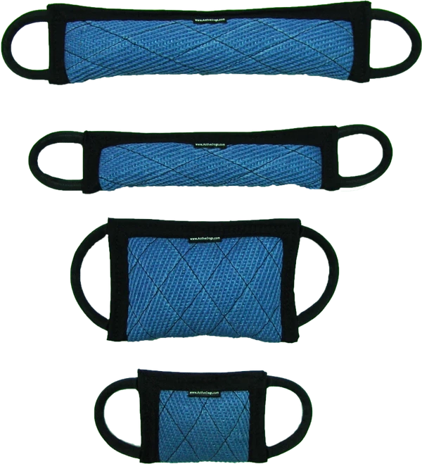 Our exclusive Blue Jute line of tugs are made of a jute that we had specially woven for this purpose. The weave is done in a herringbone pattern. There is a poly core woven throughout the weave making this jute very strong. This line of tugs all have two handles that are thick easy to hold tubular handles. All the edges of this jute are lined and bound for a clean and durable finish. Four different sizes of tugs are offered in this set; 8″x12″ tug, 4″x16″ tug, 5″x20″ tug, and the 6″x8″ tug.