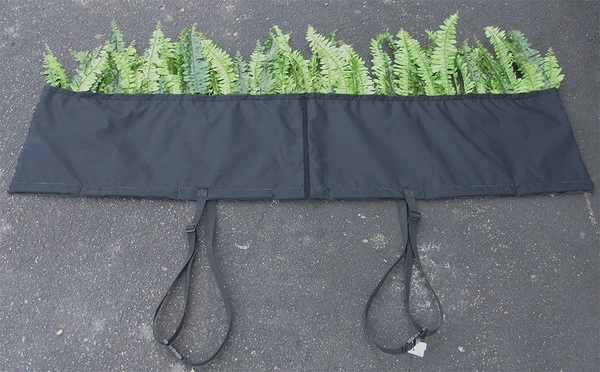 Constructed out of the same exterior fabric that our hurdle is constructed of, the top foliage is soft and will not hurt the dogs underbelly. The foliage is bendable so you can arrange it how you would like and if it gets smashed down just bend it back in position. Slip the Brush Boot Topper easily over the hurdle. The weighted hem in it and two buckling adjustable securing straps hold it securely in place. The Brush Boot Topper will not fall off or be pushed off the hurdle. When not in use roll up for easy storage. Because the side poles slip through the Brush Boot Topper the topper can be used when the jump is at any height you set and use. Made in the USA