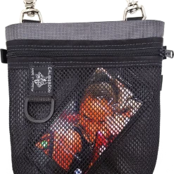 The CaliberDog Bait Bag is the best of all bait bag designs because of its many features. It is built with CaliberDog materials so it is built to last. It has several features: The front of the bag has a mesh pocket so your cell phone can be easily seen and heard when it rings. Because the mesh pocket zips you don’t have to worry about losing your phone when running. If you use head phones then the headphone cord can slip out the top of the zipper, leaving the phone secured in the pocket. There is a black D-ring on the bag front for clipping poop bags, keys, etc. There are two interior pockets. The second interior pocket has a hook & loop top closure. The front contoured pocket is vinyl lined with water resistant materials so it is very easy to clean out. The back outside of the CaliberDog Bait Bag has a small zipper pocket perfect sized for cash and cards. The exterior of this bag is made from the CaliberDog ripstop gray materials. This bag has double wall construction.