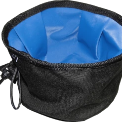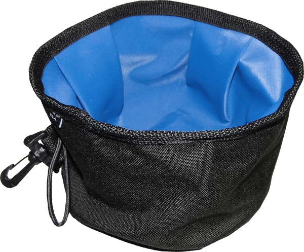 Large capacity foldable dog bowl for water or food. Like everything made in the CaliberDog series, it is the finest of goods and materials. Comes in black color with blue interior. This foldable water/food bowl is a large capacity bowl holding 64oz of fluid. It comes with bungee wrap so you can fold and roll up the bowl for storage. It has an attached no rust black plastic swivel snap so you can attach it for travel or you can hang the bowl for drying.