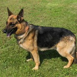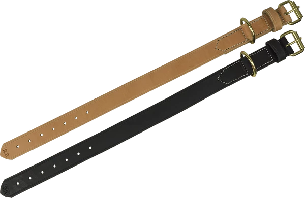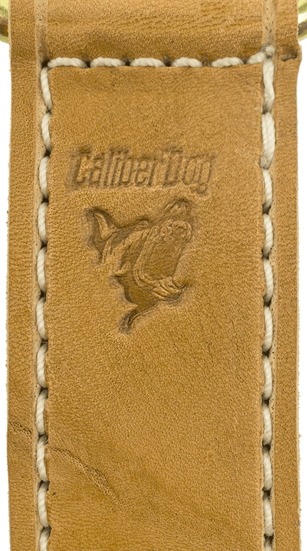 The CaliberDog Leather collar is hand crafted with exquisite decorative grooved detailing. The collars are made with either black latigo leather or tan harness leather to provide top quality and durability. Both feature brass plated hardware and gorgeous white stitching for additional strength. They offer a leather loop to feed the loose end of the collar back through which improves comfort and appearance. The collars are made with 1.5” wide single layer leather, making them light and pliable, yet extra thick leather for maximum strength.. On each collar there are 7 holes of adjustment and there is 1″ in between each hole.