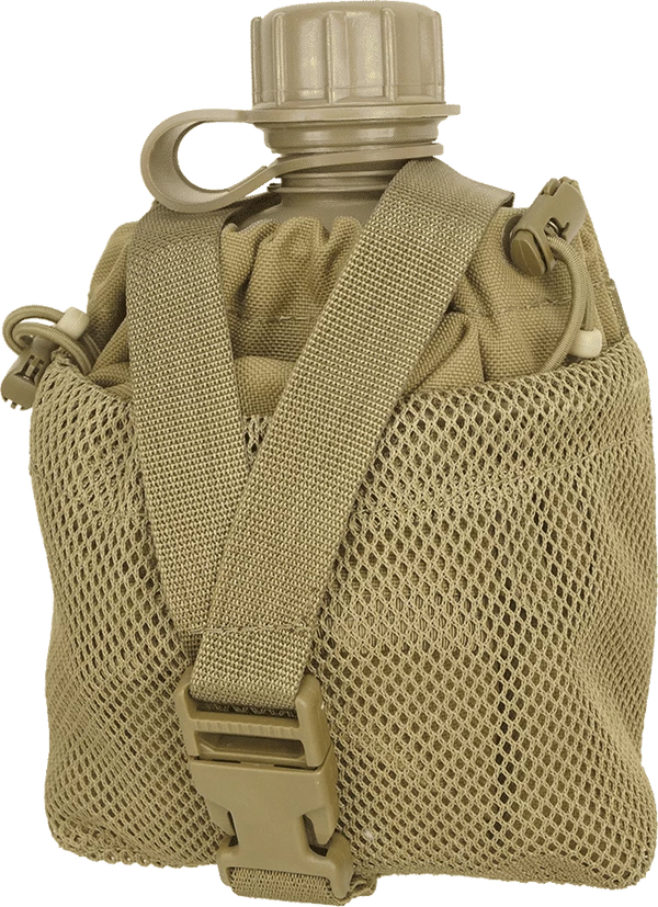 Now your working K9 can carry its own water supply and dish. The MOLLE Canteen Bag is made to be used with the K9 Tactical MOLLE Vest or by itself. If attaching to the vest it clips on easily with two webbed MOLLE sticks, included with the MOLLE Canteen Bag. The Canteen Bag comes with a plastic one quart screw top canteen bottle. The canteen securely fits into the bag with locking bungee draw cord and plastic side release buckle so it can easily be removed from its bag. The front of the bag has a mesh pocket that houses the foldable water dish. The water dish is double layer, waterproof material.