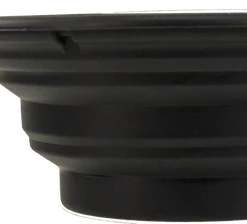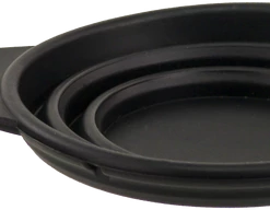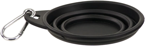Make sure your dog always have easy access to food or water while they’re traveling with you. This collapsible pet bowl holds 8 oz of water, but is only 1/2″ thick when fully collapsed. This bowl is made of flexible black silicone so it will dry quickly and can fit comfortably in most pockets. Approximately 4 and 3/8″ diameter with a 3/4″ tab, where the included metal carabiner clips on. Diameter of base is 2.5″ and expanded height is 1 7/8″.