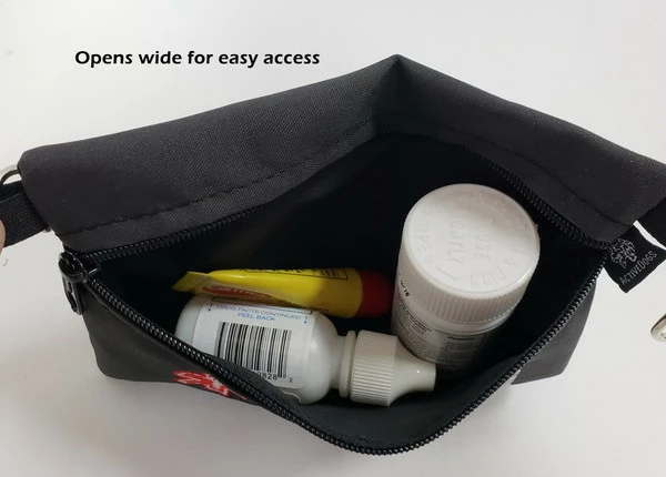 The Service Dog Clip-On Embroidered Pouch is a handy pouch that can easily clip on the D-Rings of any ActiveDogs vest. The pouch comes embroidered with large white letters that displays the words “Service Dog” & a red medical insignia. The Service Dog Clip-On Embroidered Pouch has a wide mouth zipper opening to make accessing your items quick & easy. The sides of the pouch each have a spring snap so it can be attached to the dogs harness, vest, tote, bags, etc. The pouch can hold a variety of items such as; pack of the ADA cards, keys, a small pill bottle, emergency medication such as epi-pen, headphones, money, credit cards, poo bags, etc. Embroidered by Activedogs.com in the USA.
