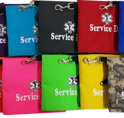 Our newly redesigned Clip-On Service Dog ID Pocket Bag is made with 1000 denier coated fabric to make it durable and easy to clean. One side of the bag has a zippered pocket with a clear vinyl window for identification cards or medical paperwork. The other side is embroidered with large text: Service Dog and a medical cross. At the top, there is a zipper with a pull tab and 2 snaps for attaching the Pocket Bag to your dog’s vest, your clothing, or gear bag.