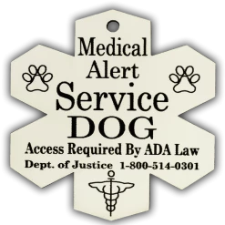 The Medical Alert Service Dog Engraved Tag is made from high quality acrylic plastic. This tag measures approx 2.5″ and is laser engraved on one side with the words “Medical Alert Service Dog Access Required By ADA Law” the tag also includes the Dept of Justice phone number. Our Medical Alert Tag comes with a pre-drilled hole and a split key ring for easy attachment to any harness or equipment.