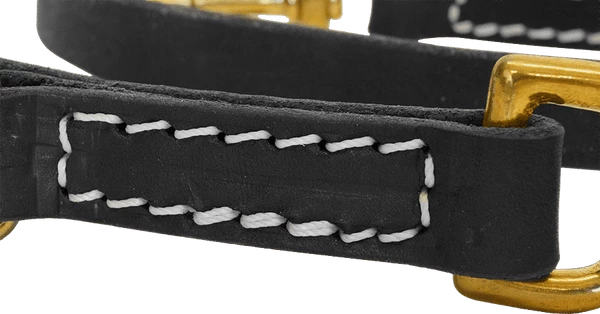 This style of working dog lead is often used in police, Schutzhund, and service dog work. This lead is made with 3/4″ quality latigo leather and the hardware is stitched into the leather for extra durability. Brass hardware is used on this lead. Latigo leather is a durable, flexible, softer leather and it breaks in faster. It is dyed solid all the way through, so it will not fade. Because of the conditioners that are infused with oils during the process latigo leather is almost waterproof. It will not dry out like most harness leather. It can be easily cleaned and oiled after use.