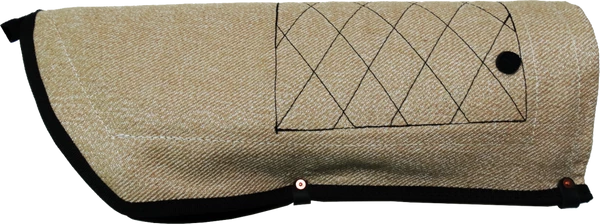 The Jute Puppy Sleeve is made with a double layer of jute. It is padded for safety and has a quilted lining for comfort. The interior has a formed handle so you can easily pull your arm into the sleeve. At the top is a loop for hanging the sleeve. I have used this to drag the sleeve in front of the pup to excite the puppy to chase and bite the sleeve. It helps motivate and train the puppy. This sleeve will help transition the young dog into a regular harder bite sleeve. The puppy sleeve is a beginning softer sleeve experience for the young dog. It will promote the pup to bit as it has a spongy soft bite. Can be worn on the helpers right or left arm. Made in USA.