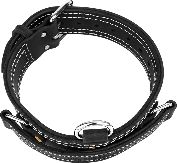 The placement of the D-ring allows the collar and the handle to be in proper position when doing agitation work. This collar has a lay flat handle so the handle stays out of the way when not used. The buckles and hardware are nickel plated. Made in USA