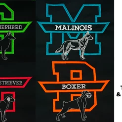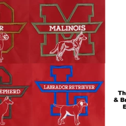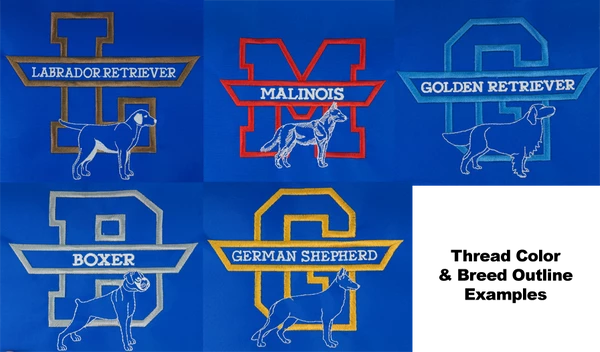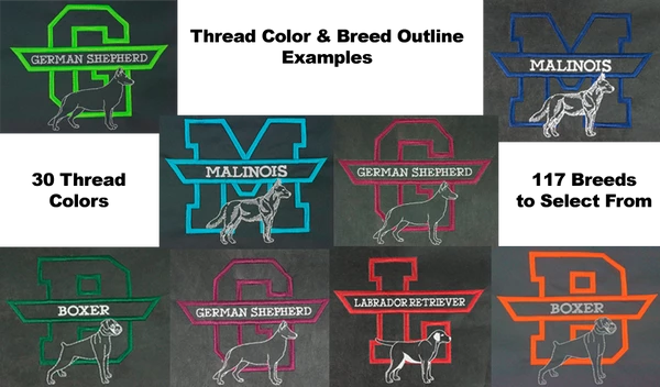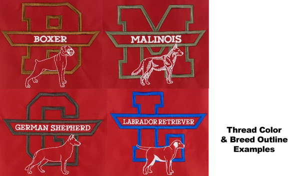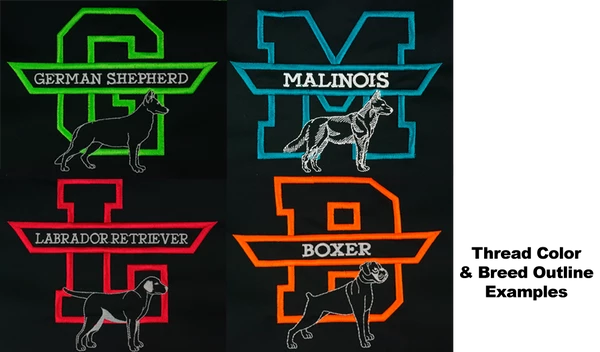 Our embroidery graphics, done in house, are done with high count, durable, high sheen, polyester threads. The outline color of the breed and the breed name will always be white.