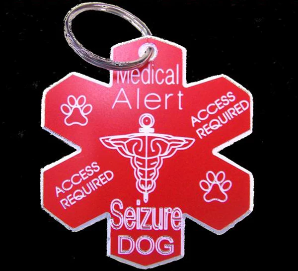 The Medical Alert Seizure Dog ID Tag that is engraved on one side. It is made from red acrylic with white, recessed lettering.