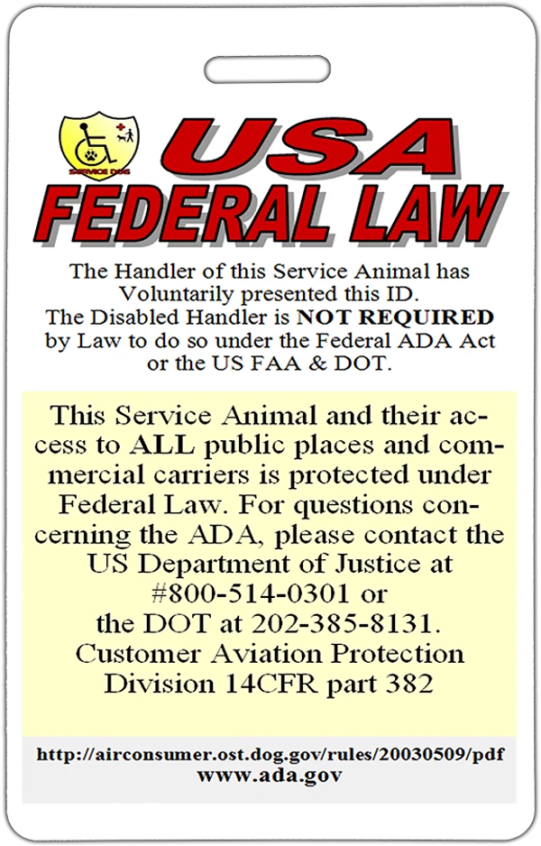 Service Dogs: A person must be legally disabled and their dog must perform a task for them. The handler has public access rights with a Service Dog and they are protected under Federal ADA Law, and are allowed access to public property with their Service Dog.