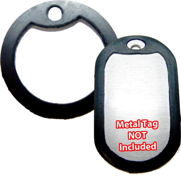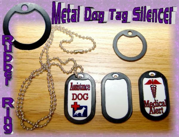 The Metal Tag Silencer is a round, rubber ring that stretches and fits around the edge of our Metal Dog Tags and Metal Collar ID Tags.