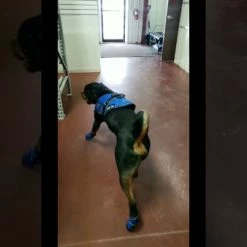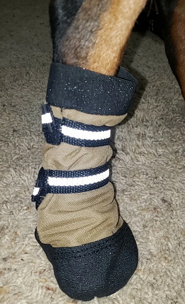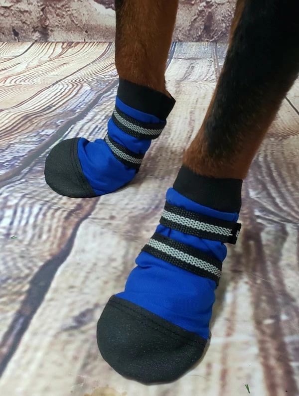 Our Non-Slip Dog boots have many features worthy of your 4 legged companion. These booties are a simple on and off style with an elastic top; which, helps in putting the boots on the dog. There are two reflective adjustable straps that hold the boots securely on your dog’s paws. The boot toe and bottom areas are covered in a PVC Resin coated fabric; This is a non-slip material giving extra grip while walking on slippery surfaces, is water resistant, and provides paw protection.
