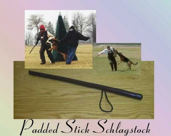 Padded Stick “Schlagstock.” This is the traditional padded stick that is used in Schutzhund/trials. The word “Schlagstock” is German for the word Baton. The Schlagstock is used in protection dog training. The dog is taught courage for when someone comes at them with a object. This stick has a flexible padded core. The extreior is made of man made faux suede. It is not a hard hit on the dog because of the padding. It measures 24″ in length and is 1.5″ wide with a leather suede handle to wrap around your wrist. The leather wrist wrap helps to keep the stick in position while using. The 1.5″ width makes for a comfortable grab and the faux suede is non-slippery. Made in the USA.