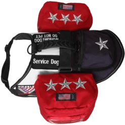 The handle is an easy soft grip molded vinyl handle. In both front and back ends of the handle are attached black strong metal welded D-rings for attaching a leash. There are three packs on this vest. Two beautiful red side packs and one navy blue top pack. The top pack is attached to the dog vest and very handy for small items that can be retrieved quickly, such as pill bottles, keys, etc. The unique side packs can be taken off and carried into the store with a detached web handle. The Patriotic Tri Pack dog Vest comes with the pack handle. These side packs have a three sided full open access zipper along the top edge of the pack. One side pack has an exterior netted pocket that would work well for things that you want at your fingertips such as keys. The other side pack has an exterior clear window, hook and loop closing pocket for your ID. These packs are designed so the dog can still laydown or sit comfortably while wearing the packs on the dog vest. These packs will not flop around the vest as they are attached with a plastic loop ring and commercial hook & loop tape.