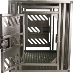 • Crate Material – Both top and bottom of crate are made with polished, 1/8″ thick diamond plate aluminum and a 2-inch width between aluminum TIG welded bars. Made with aluminum, it is a perfect material for dog crates for its light weight, strength, rust free, and it will not absorb the sun’s heat. We use the TIG welding process for all of our aluminum welding as it provides the strongest aluminum weld. Crate is extremely durable and is great for power dogs who escape from those plastic kennels.