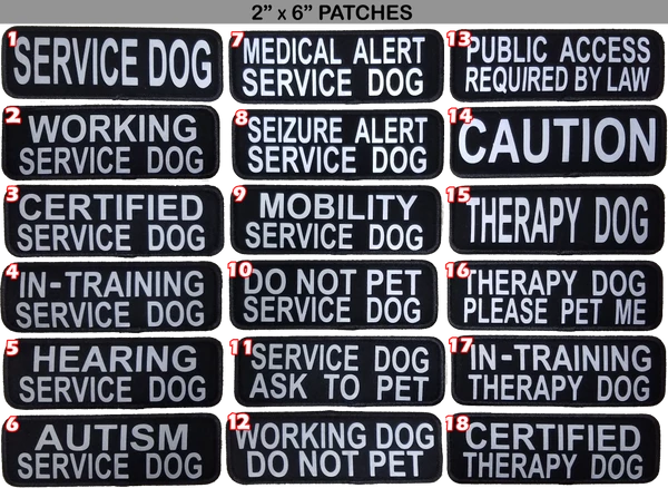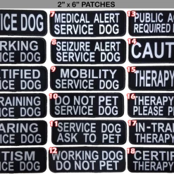 Reflective patches will reflect a light source which will cause them to shine in the dark. The reflective patches add a safety feature to any dog vest, harness, or clothing.  Choose from 18 patch text style choices.  Choose from three sizes;  1.5″x 3.5″, 2″ x 4″, 2″ x 6″.