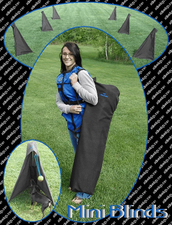 The Mini Blind is a economial training tool in teaching your dog to run the blinds when you don’t have the space or don’t want to invest in a full size set of blinds. These little blinds are being used all over Europe for training. The Mini Blinds work great for practice and are so portable you can train anywhere. Our Mini Blinds are patterned after our full size blinds and made with the same high quality construction. We use outdoor marine grade fabric that will not fade or rot. We have incorporated our blind hold down stake system in these little blinds. They are a compact size for training and easy transport, poles measure 34″. They can be used indoors or outdoors and our blinds will not blow down on windy days. And like all our blinds the material will never slide down the poles. We have added an extra feature to these little training blinds. We have added a small metal close pin type clip to each blind so you can hang a ball or tug from the blind for the dog during training. You can also use the blind for the send out. Our Mini Blinds are sold in sets of six blinds. Included with each set is a strong ballistic material carrying bag with shoulder strap and handle, 18 hold down stakes, and stake bag. When you’re done using them they store away effortlessly.