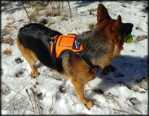 Form fitting contoured K9 harness that is set up for search & rescue tracking and trailing work. This harness is designed to be form fitting with detail to adjustments. Both the chest and girth are adjustable. There are two sets of buckles at the chest/neck area and girth so once you have the harness adjusted to your dog’s size then it is very easy to take the harness on and off because the adjustments can be left in place. You won’t have to take this harness off and on by pulling it over the dogs head. The working search & rescue dog needs to have a harness that lets the dog work in safety and comfort. This Search & Rescue Reflective padded tracking harness is padded on the back and chest plates of the harness with breathable air mesh lining. With the air mesh lining the dog will not get to hot. The chest is padded which is a great safety feature when trailing through the woods as there are often low branches and sticks that can pop up and poke the dog in the chest area. There is a D-ring set up at the back of the backplate of the harness so if you are trailing with a tracking line it is at the back of the harness making it less likely to get entangled around the dog. There is no handle or anything attached that stands up off this harness or hangs loose that could get caught on low branches and brush. The outer edges of the chest and back plates have a reflective edge on them. The harness comes with two Search & Rescue patches stitched on the front and back of the harness. There is a clear ID pocket for displacing the dog’s identification. Two sizes to choose from. Made in the USA.