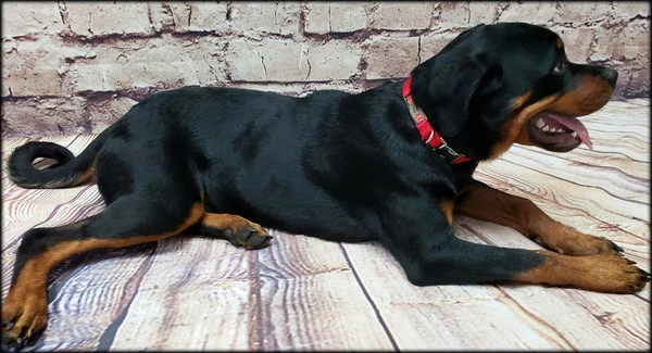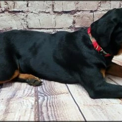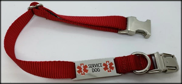 The Service Dog Chrome Tag Collar is a service dog collar with a high quality engraved tag. The chrome tag is engraved with the words Service Dog. This adjustable collar is ¾ inches wide which will work with any size dog. This is a well-made collar with sturdy all metal hardware. There are two color choices and three size choices. Matching Service Dog Hands Free Leash also available. Made in the USA at activedogs.com