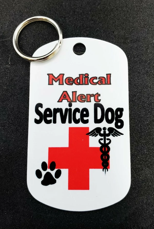 Our Metal Dog Tags are printed in color with permanent dye on a white background for high visibility. Each tag has a helpful message on it. This ActiveDogs Service Dog Identification Metal Tag is a high quality dual sided aluminum tag for people with a service dog. This aluminum dog tag is 1 7/8” x 1 1/8” in size and is available in 16 different designs. The tag comes with split ring and is a perfect size tag for working service dogs. It can also be worn on a bracelet, vest, pouch, collar or lanyard. Front of the tag is printed with the full color high quality & comes with split key ring. Design is printed on both sides of the tag. MADE IN USA