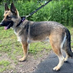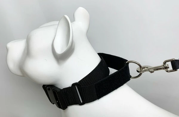 A martingale style collar is one that when you pull on the D-ring the collar will become tighter on the dog. This is a good collar for working the dog in public when you may need a little more control or when training the dog.