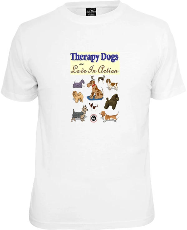 Our Therapy Dog T-shirts are available in four sizes and four different designs. They are a 100% polyester. The designs are permanent dyed. These T-shirts are durable, washable, and dry beautifully.