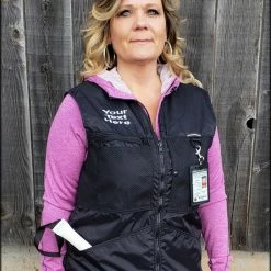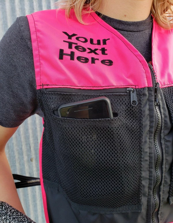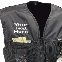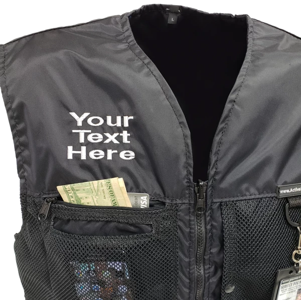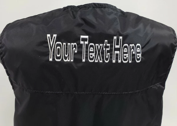 You can choose to have text or a logo embroidered on the either the left or right side of the front of the vest. A custom logo will also require a digitizing fee.