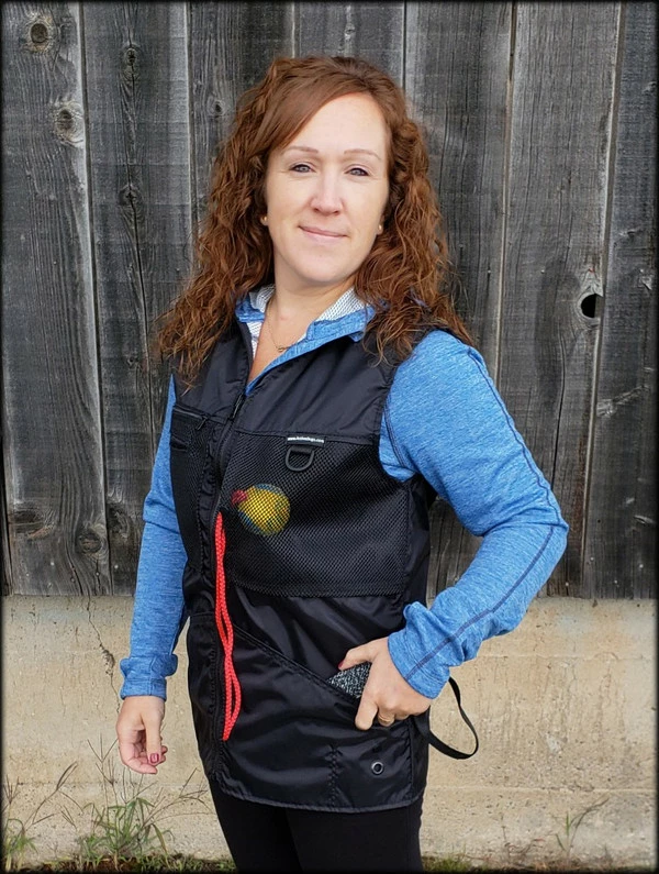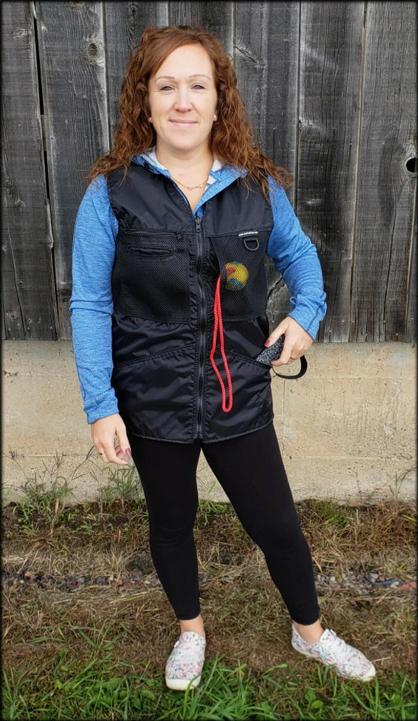 This vest was designed with a specific purpose in mind. I not only required storage in my handler vest but I wanted identification. When I am in public training a service dog I have often thought I should design an embroidered back handler vest stating “Service Dog Trainer” so people will not disrupt me while I am training. The Trainers Choice Embroidered Handler Vest does just that. This vest comes embroidered if you choose or you can have it with no embroidery. It is light weight without restriction in the neck and armhole areas so you have easy movement. It is fully lined, no scratchy seams and has a full front molded zipper. Another issue is always that pesky dog hair but dog hair dose not stick to this fabric. The vest is easily cleaned by wiping off with damp towel. Lots of pockets and D-rings on this vest, you can never have too many storage pockets. There are 7 pockets on this vest. The back has a full width pocket that can be accessed from either side, with a top center D-ring. I like this D-ring for hanging of a short pull tab or a small tug. On the front of the vest there are two large lower pockets. The top area of the vest has a great side opening mesh pocket, this works well for draping a tug or roped ball and letting the dog see it for motivation. On that same mesh pocket there is another D-ring at the top, this can be used for the same purpose. It also works great to hang a remote controller. The other side of the top has a double pocket. A mesh pocket with top opening, this is where I put my phone so I can easily hear and see it. Behind that mesh pocket is a zippered pocket, a good feature if you want to secure keys or smaller loose items. One of the best features of this vest is the built in poop bag holder. The bags are easily accessible from the vest exterior. Convenient to load on the vest lower left side. The lower right side of the vest has another D-ring. This work for hooking your leash. We will custom embroider this vest for you. You can have your text and/or logo put on the vest front. The Trainers Choice Embroidered Handler Vest is black in color and comes in five sizes. USA MADE