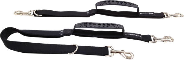 The Wheelchair Pulling Dog Leash color is black; it has two chrome bolt snaps. The overall length from snap end to snap end is either 24” or 36”. See product #707586 for the Pulling & Balance Harness that works with this leash.
